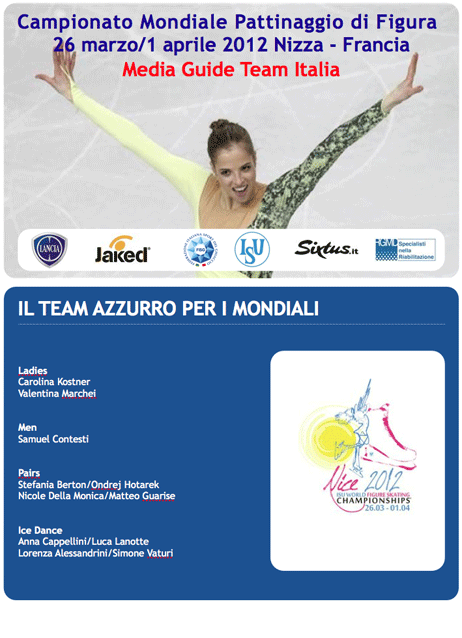 In allegato la cartella stampa di presentazione dei Campionati del Mondo 2012 di Pattinaggio di Figura in calendario dal 26 marzo all’1 aprile a Nizza (Francia).